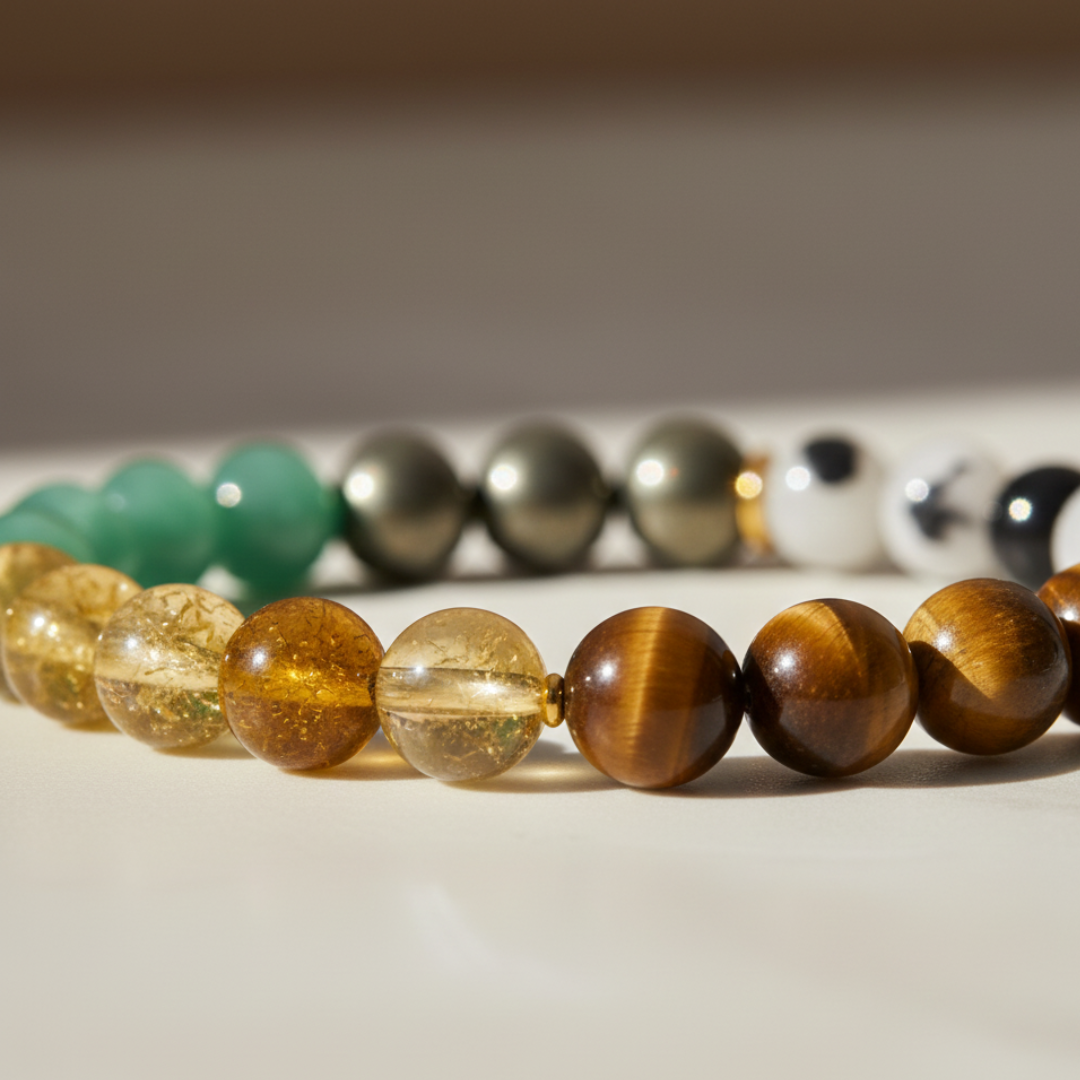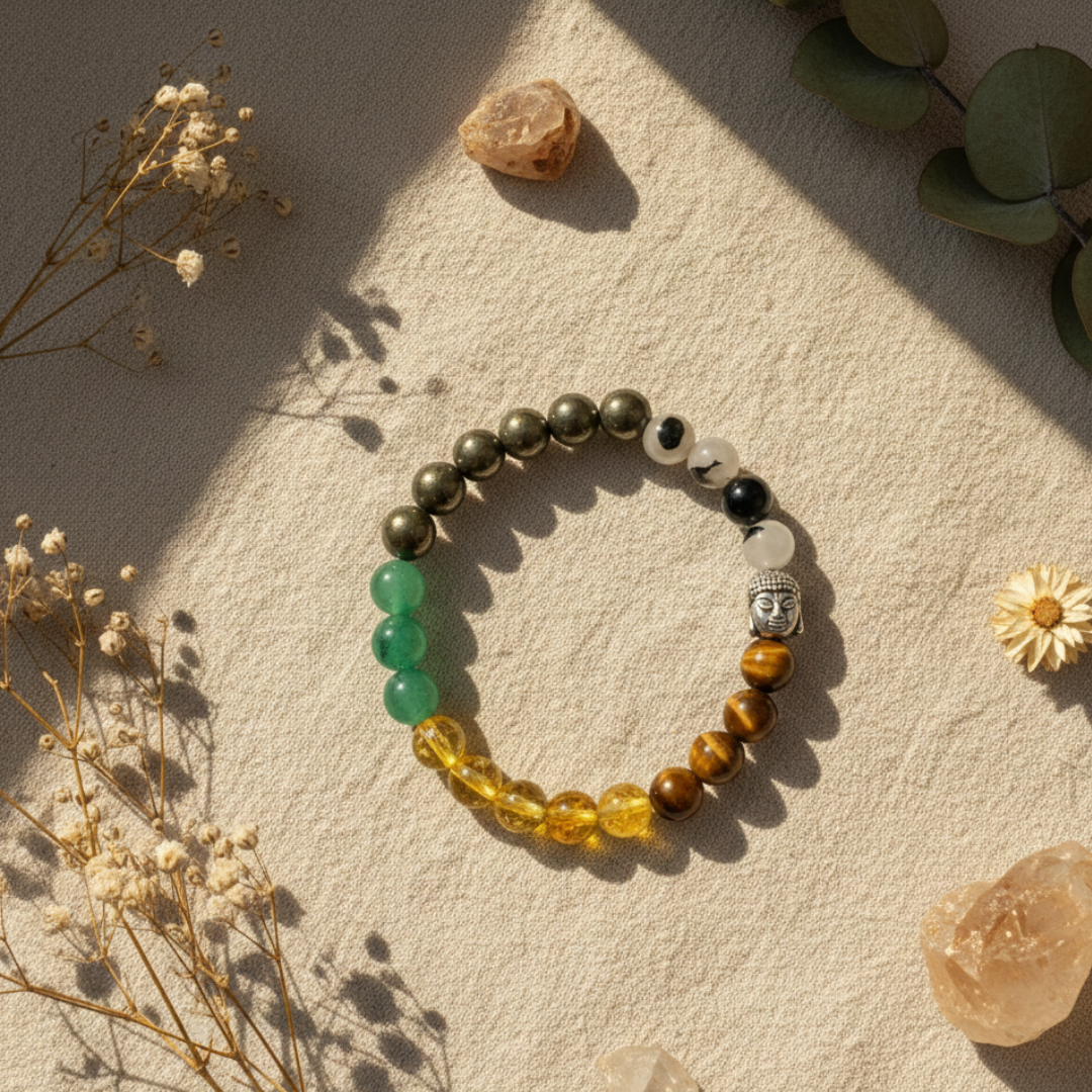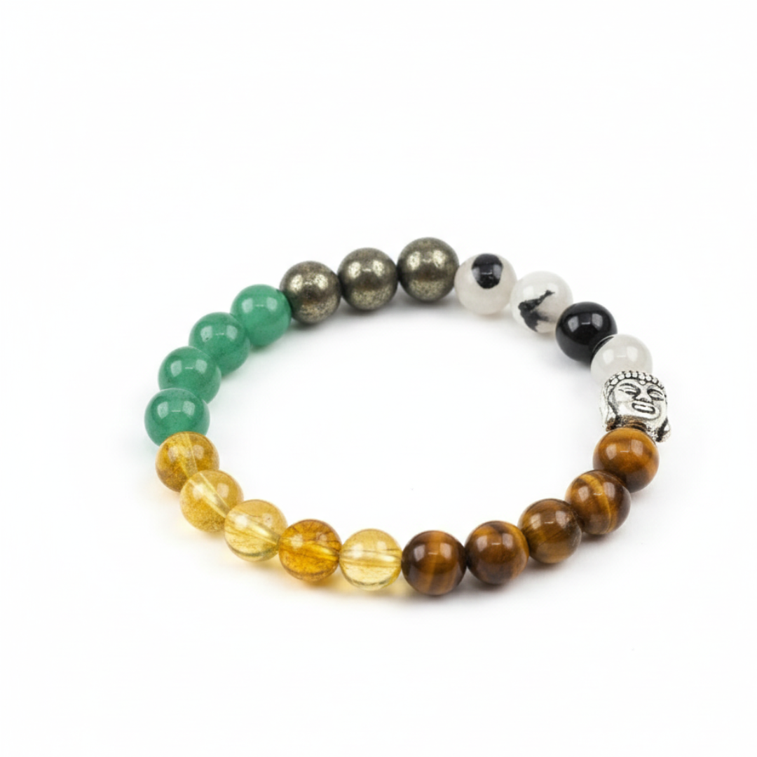 Full Abundance Bracelet Shiv sahkti Ratna Attract Wealth, Success & Limitless Opportunities Clear your path to financial success with our handcrafted Full Abundance Bracelet, thoughtfully designed using 100% natural, high-vibration crystals. This premium energy bracelet is created to dissolve money blockages, attract abundance, and magnetize career-boosting opportunities into your life. Whether you're seeking business growth, a career breakthrough, or a more stable financial future, this powerful combination of crystals supports you at every step. What Makes the Full Abundance Bracelet Special? Our signature bracelet features a scientifically researched and energetically balanced blend of crystals known for wealth and prosperity: Tiger Eye – Boosts confidence, courage & decision-making Pyrite – The ultimate money magnet; attracts wealth & opportunities Citrine – Enhances earning potential and prosperity flow Green Aventurine – Brings good fortune & new opportunities Tourmalated Quartz – Removes energy blockages and protects from negativity Together, these stones create a powerful energetic field that aligns you with abundance, success, and growth. Benefits of the Full Abundance Bracelet Attracts new business & career opportunities Boosts confidence, self-worth, and leadership energy Supports entrepreneurial success & growth Helps remove money blockages and the scarcity mindset Increases financial stability & security Enhances earning potential and wealth-building ability Attracts good fortune, lucky breaks & unexpected opportunities Ideal For This bracelet is designed for everyone, especially: Housewives seeking new career or business opportunities Small business owners & start-up founders Entrepreneurs & freelancers Consultants & investors (Stock Market, Mutual Funds, etc.) Individuals seeking career growth, job change, or expansion Anyone facing career stagnation Anyone ready to welcome abundance into their life Why Wear Crystals on the Left Hand? According to energy principles: The left side of the body absorbs energy The right side emits and gives out energy By wearing crystals on your left hand, you absorb their full benefits deeply and effectively Since the intention of this bracelet is to bring abundance towards you, wearing it on the left hand maximizes its energetic impact. Handcrafted • Natural Crystals • Energy-Charged Every Full Abundance Bracelet is: Handmade with ethically sourced, 100% natural crystals Cleansed & energetically charged before dispatch Designed for everyday comfort and durability Unlock the Flow of Wealth & Success Today Step into your power and invite abundance into every area of your life. The Full Abundance Bracelet is more than jewelry— it’s a financial empowerment tool, an energetic shield, and your personal wealth magnet. Wear it. Believe it. Attract it.