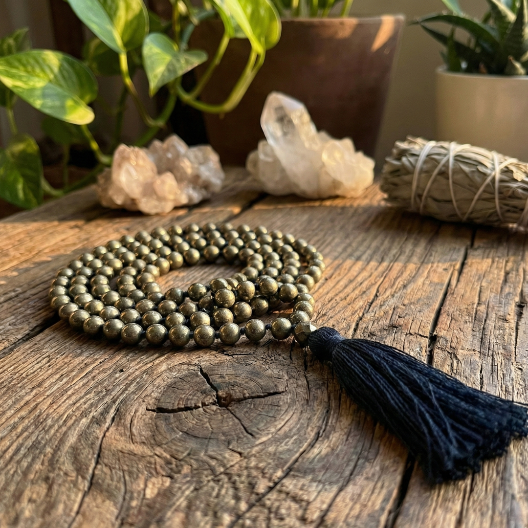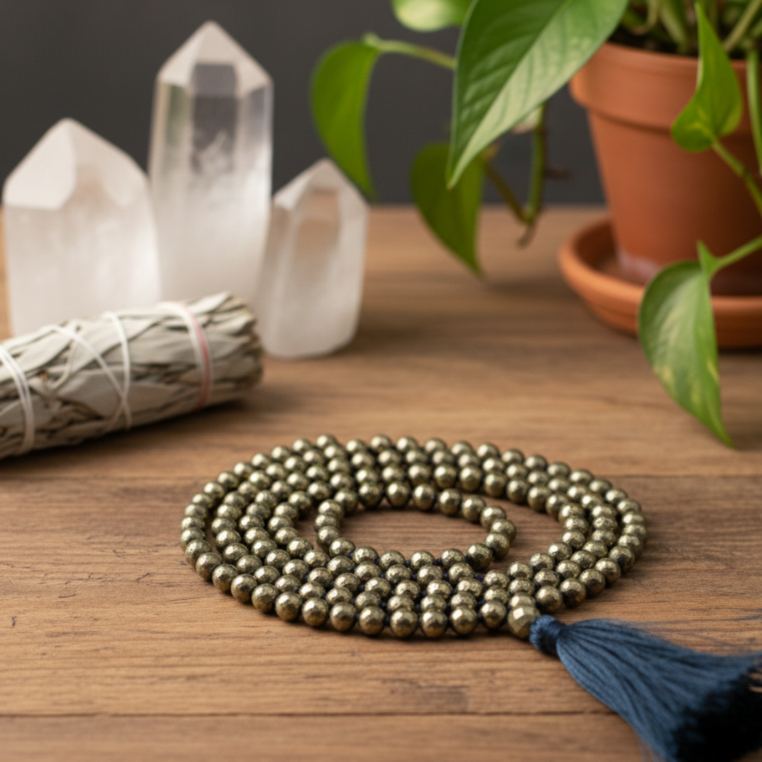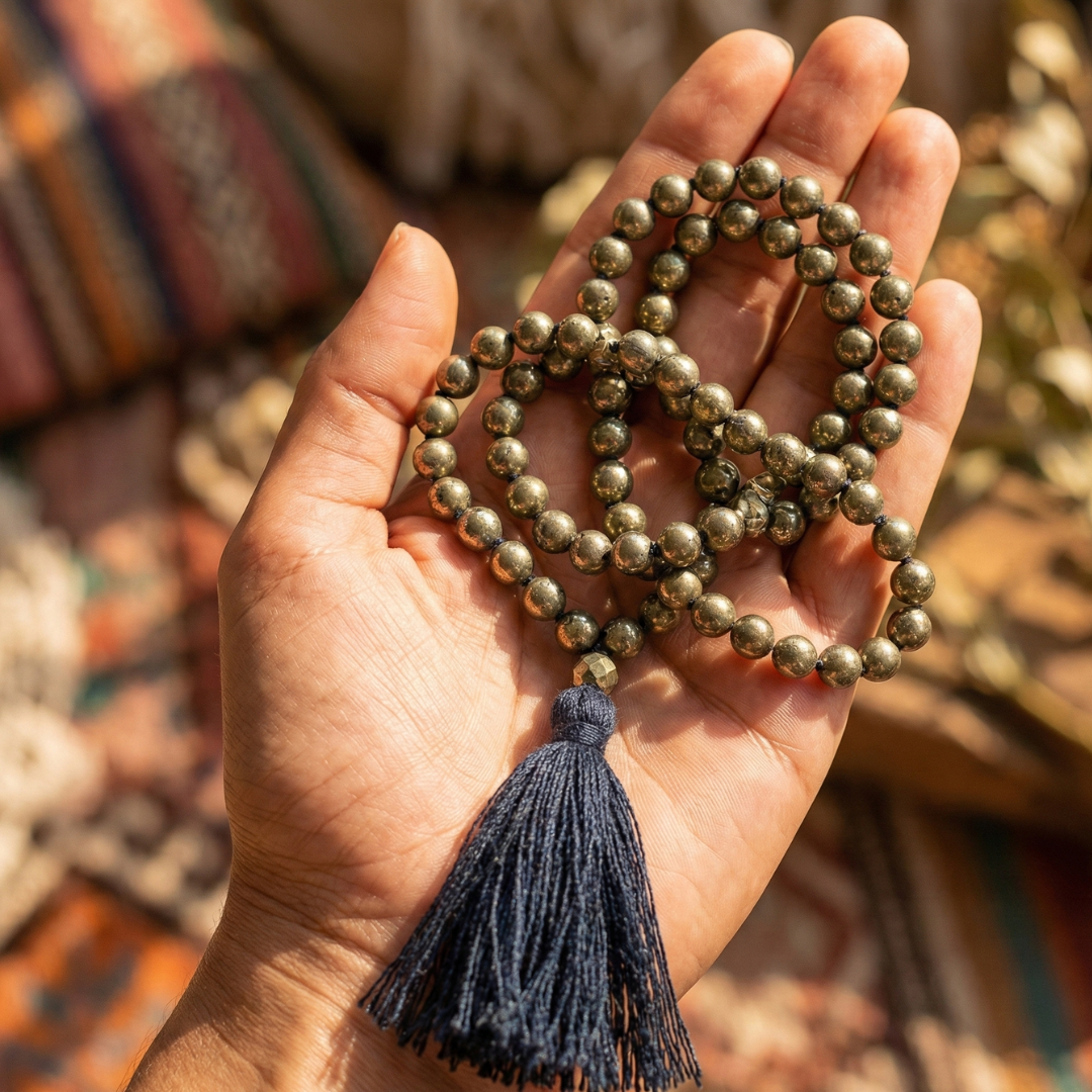 Pyrite Crystal Mala – Shiv Shakti Ratna Attract Wealth • Unlock Success • Manifest Abundance Step into a life of prosperity and confidence with the Pyrite Crystal Mala from Shiv Sakti Ratan, expertly handcrafted with 100% natural, premium-grade Pyrite beads. Celebrated as the Stone of Wealth & Opportunity, Pyrite is known for its extraordinary power to magnetize money, enhance financial growth, and bring success into your life. Whether you're an entrepreneur, professional, or someone striving to strengthen financial stability, this mala acts as your energetic companion—uplifting your mindset, sharpening decisions, and clearing the path to abundance. Key Benefits of the Pyrite Crystal Mala Attracts Wealth & Opportunities – Helps draw money, new clients, and profitable ventures. Boosts Higher Income & Financial Rewards – Enhances manifestation energy for career and business growth. Manifests Prosperity & Good Fortune – Supports long-term success and consistent progress. Improves Financial Decision-Making – Encourages logic, clarity, and confidence in money matters. Shifts Mindset Toward Abundance – Replaces fear with empowerment and prosperity-focused thinking. Reduces Financial Stress – Helps calm anxiety related to money, bills, or career uncertainty. Supports Entrepreneurial Ventures – Ideal for business owners seeking expansion, stability, and bold action. Helps Overcome Debts & Losses – Energizes motivation and resilience to rebuild financial strength. Product Details Crystal Type: 100% Natural Pyrite Bead Type: Hand-polished, shimmering metallic Pyrite Color: Golden metallic Purpose: Wealth, success, motivation, confidence Gender: Suitable for All Who Should Wear This? This Pyrite Mala is perfect for: Entrepreneurs & Business Owners Financial Advisors & Planners Marketing & Sales Professionals Individuals facing debt or financial instability Anyone wanting to improve money management & planning Anyone seeking to strengthen the Root Chakra for stability and security Those who want to boost confidence, courage, and success energy Why Choose Shiv Sakti Ratan? At Shiv Sakti Ratan, every mala is energetically cleansed, handcrafted with precision, and made using certified natural crystals to ensure purity, beauty, and powerful vibration.