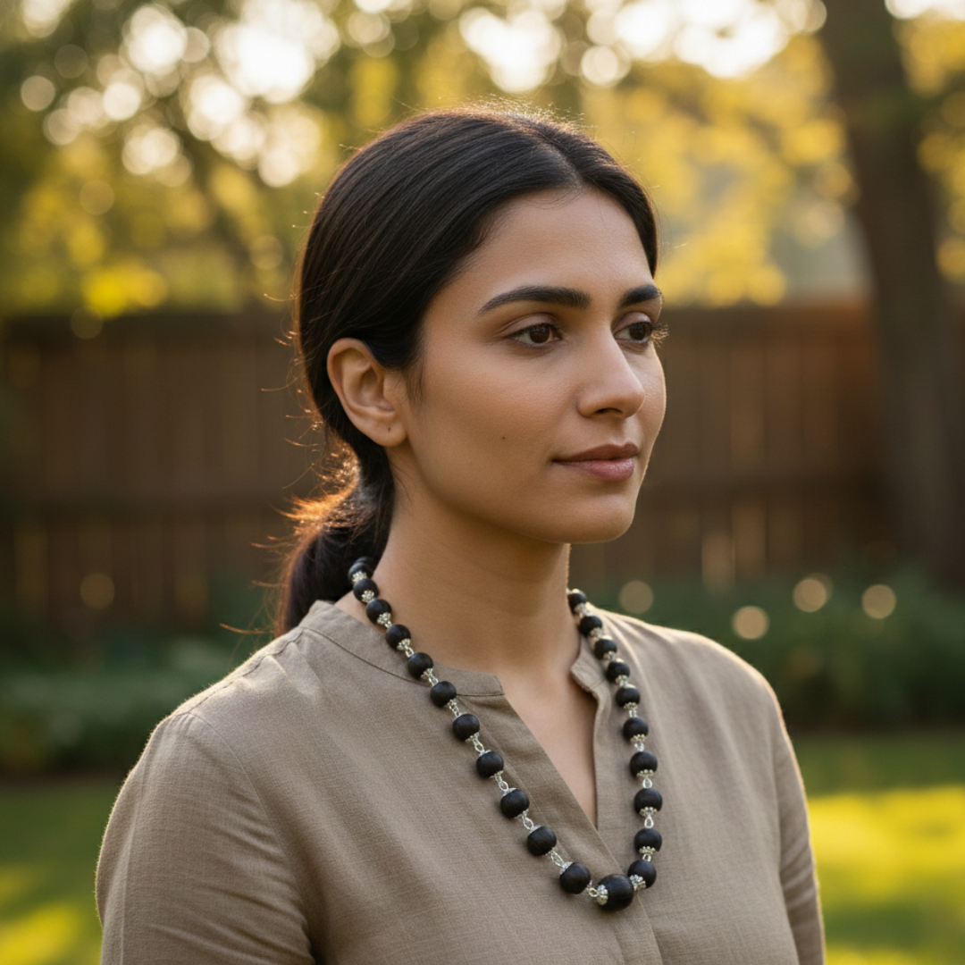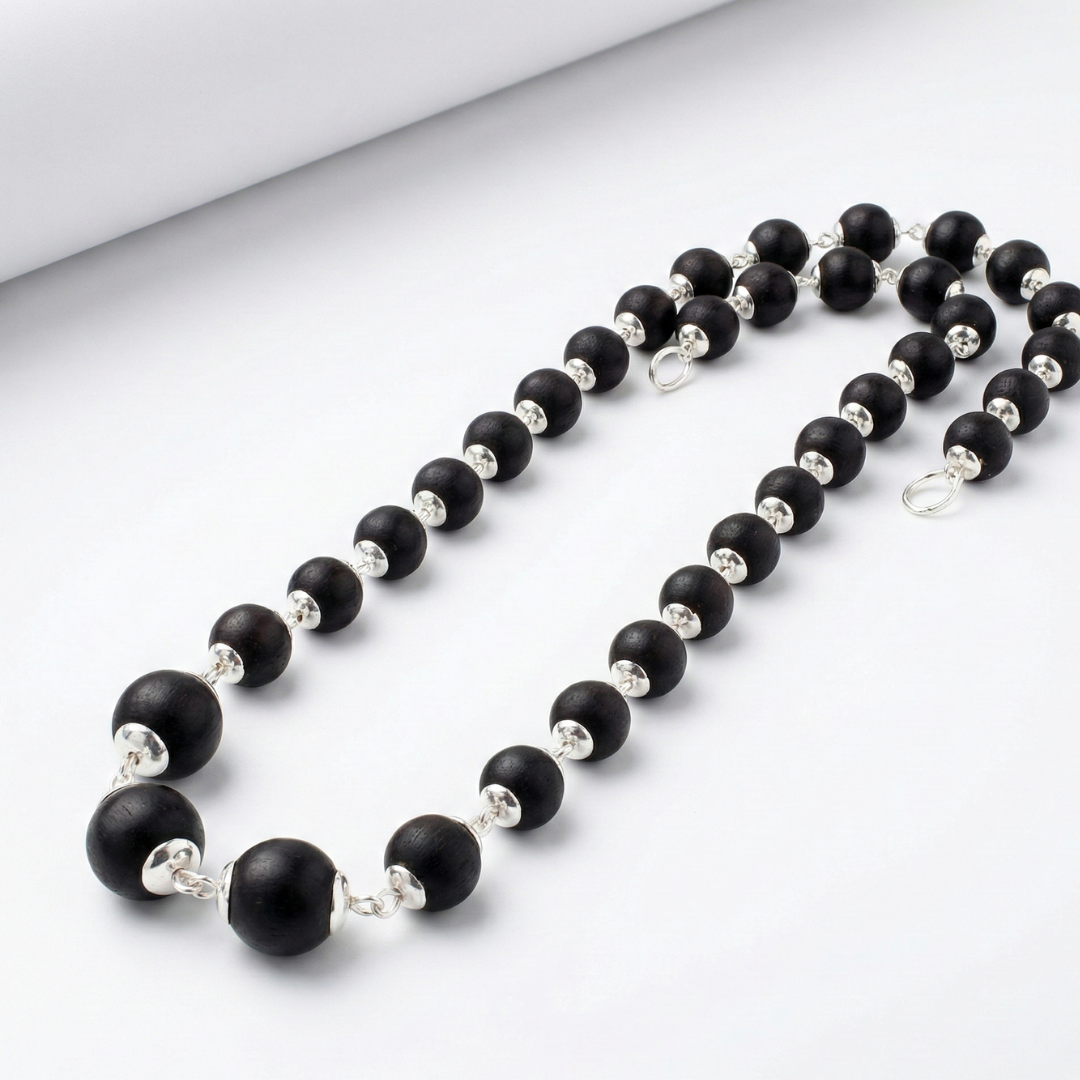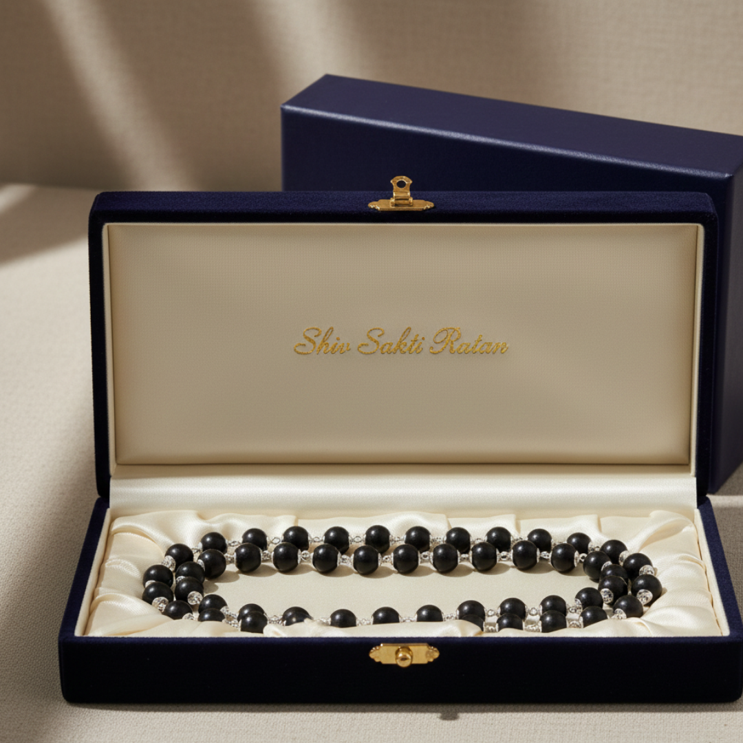 Silver Plated Eternal Karungali Mala – Shiv Shakti Ratna Elevate Your Spiritual Journey with the Divine Power of Karungali Experience profound tranquility and sacred energy with our Silver Plated Eternal Karungali Mala, meticulously crafted to enhance your spiritual practices, meditation, and daily devotion. Designed for seekers of purity and peace, this mala blends timeless tradition with refined craftsmanship. Why Japam with Karungali? Handcrafted from authentic Karungali (Ebony) beads, this mala carries a natural, grounding energy known to: Enhance inner peace and emotional balance Strengthen intuition and spiritual awareness Deepen your connection with nature and the universe Support focus during meditation, chanting, and Japam Karungali is revered in ancient spiritual practices for its protective aura and ability to dispel negative energies, making it an essential tool for anyone seeking clarity and serenity. Product Details Material: Natural Karungali (Ebony) Beads with Silver-Plated Accents Bead Size: Approximately 7mm to 8mm (natural variations may occur) Length: 22 inches approx. (free-size, suitable for all) Texture: Smooth, hand-polished finish Craftsmanship: Precision handmade under strict quality standards Each bead is thoughtfully selected and polished to perfection, ensuring uniformity, comfort, and long-lasting beauty. Cleansing & Energetic Care To purify your Karungali Mala upon receiving it, simply place it in a bowl of rice for 24 hours. This helps absorb positive vibrations and recharge the natural energy of the beads. Care Instructions To maintain its spiritual potency and physical charm: Keep away from water, perfumes, and harsh chemicals Avoid exposing it to extreme temperatures Store in a soft pouch or moisture-free zip-lock bag Handle with care, as each bead holds unique natural energy Why Choose Shiv Sakti Ratan? Every mala we create is infused with devotion, quality, and authenticity. Our Silver Plated Eternal Karungali Mala is more than a spiritual accessory—it's a lifelong companion for meditation, grounding, and personal transformation.