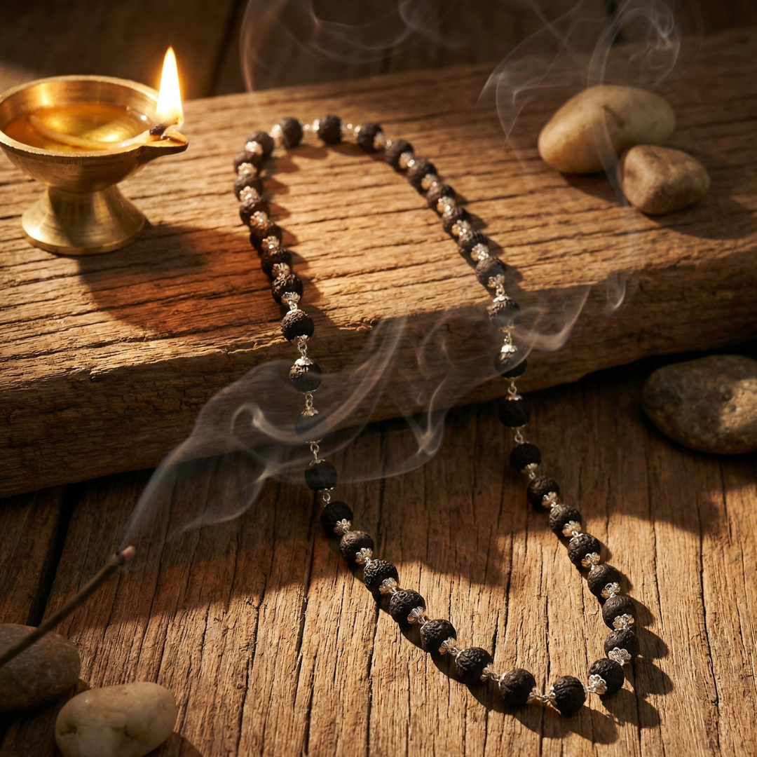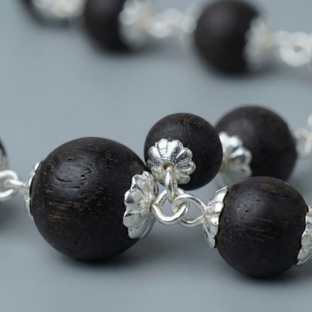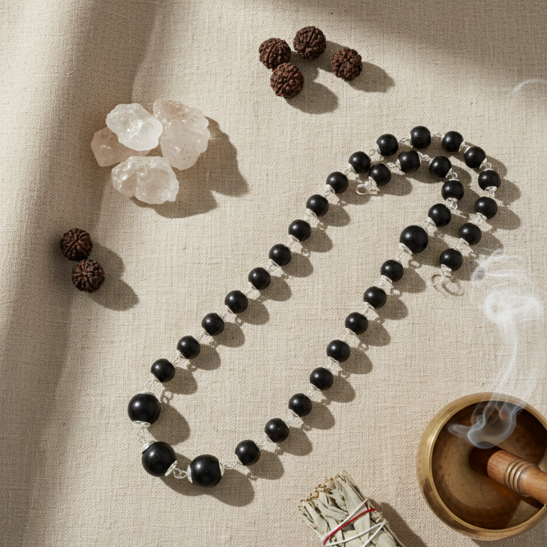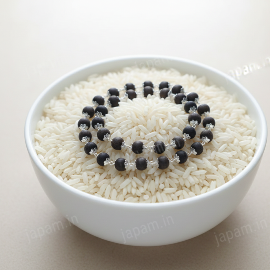 Silver Plated Eternal Karungali Mala – Shiv Shakti Ratna Elevate Your Spiritual Journey with the Divine Power of Karungali Experience profound tranquility and sacred energy with our Silver Plated Eternal Karungali Mala, meticulously crafted to enhance your spiritual practices, meditation, and daily devotion. Designed for seekers of purity and peace, this mala blends timeless tradition with refined craftsmanship. Why Japam with Karungali? Handcrafted from authentic Karungali (Ebony) beads, this mala carries a natural, grounding energy known to: Enhance inner peace and emotional balance Strengthen intuition and spiritual awareness Deepen your connection with nature and the universe Support focus during meditation, chanting, and Japam Karungali is revered in ancient spiritual practices for its protective aura and ability to dispel negative energies, making it an essential tool for anyone seeking clarity and serenity. Product Details Material: Natural Karungali (Ebony) Beads with Silver-Plated Accents Bead Size: Approximately 7mm to 8mm (natural variations may occur) Length: 22 inches approx. (free-size, suitable for all) Texture: Smooth, hand-polished finish Craftsmanship: Precision handmade under strict quality standards Each bead is thoughtfully selected and polished to perfection, ensuring uniformity, comfort, and long-lasting beauty. Cleansing & Energetic Care To purify your Karungali Mala upon receiving it, simply place it in a bowl of rice for 24 hours. This helps absorb positive vibrations and recharge the natural energy of the beads. Care Instructions To maintain its spiritual potency and physical charm: Keep away from water, perfumes, and harsh chemicals Avoid exposing it to extreme temperatures Store in a soft pouch or moisture-free zip-lock bag Handle with care, as each bead holds unique natural energy Why Choose Shiv Sakti Ratan? Every mala we create is infused with devotion, quality, and authenticity. Our Silver Plated Eternal Karungali Mala is more than a spiritual accessory—it's a lifelong companion for meditation, grounding, and personal transformation.